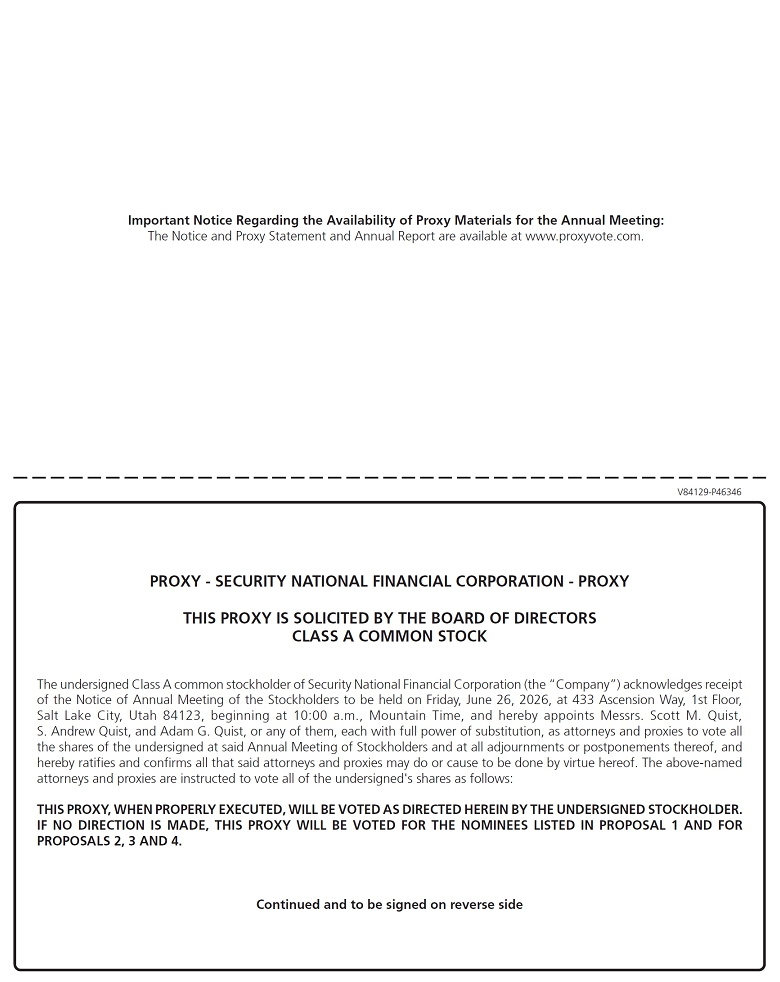 This Proxy Statement is furnished in connection with the solicitation of proxies by the Board of Directors of Security National Financial Corporation (the “Company”) for use at the Annual Meeting of Stockholders (the “Annual Meeting”) to be held on Friday, June 26, 2026, at 433 Ascension Way, 1st Floor, Salt Lake City, Utah 84123, beginning at 10:00 a.m., Mountain Daylight Time, or at any adjournments or postponements thereof. The shares covered by the enclosed proxy, if such is properly executed and received by the Board of Directors prior to the meeting, will be voted in favor of the proposals to be considered at the Annual Meeting, and in favor of the election of the nominees to the Board of Directors (with three nominees to be elected by the Class A common stockholders voting separately as a class, and six nominees to be elected by the Class A and Class C common stockholders voting together) as listed unless such proxy specifies otherwise, or the authority to vote in the election of directors is withheld.
