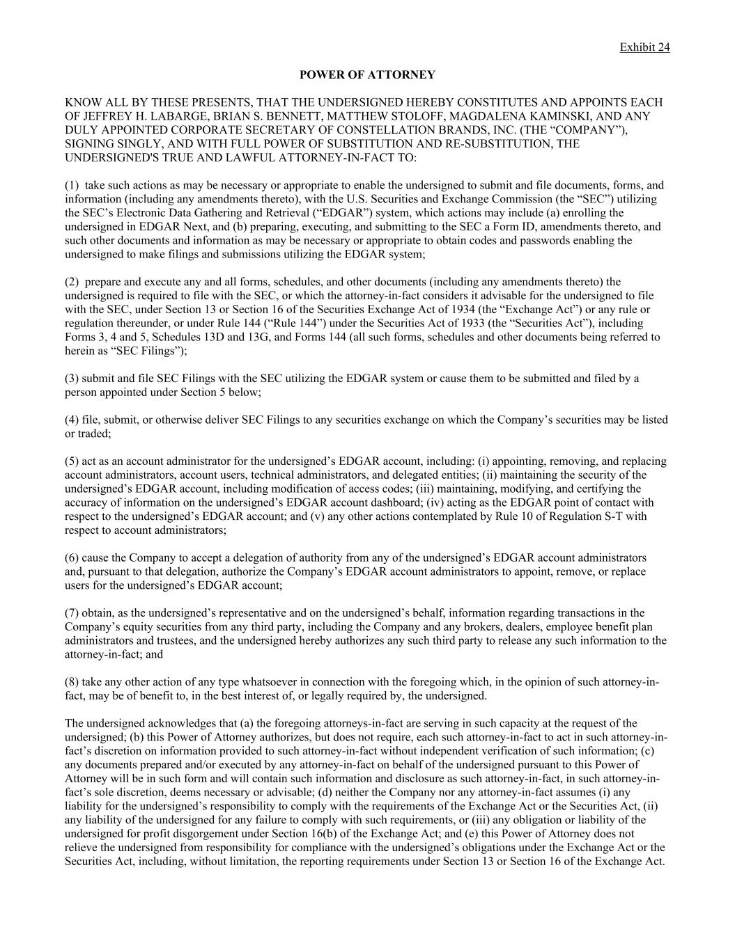 Exhibit 24 POWER OF ATTORNEY KNOW ALL BY THESE PRESENTS, THAT THE UNDERSIGNED HEREBY CONSTITUTES AND APPOINTS EACH OF JEFFREY H. LABARGE, BRIAN S. BENNETT, MATTHEW STOLOFF, MAGDALENA KAMINSKI, AND ANY DULY APPOINTED CORPORATE SECRETARY OF CONSTELLATION BRANDS, INC. (THE “COMPANY”), SIGNING SINGLY, AND WITH FULL POWER OF SUBSTITUTION AND RE-SUBSTITUTION, THE UNDERSIGNED'S TRUE AND LAWFUL ATTORNEY-IN-FACT TO: (1) take such actions as may be necessary or appropriate to enable the undersigned to submit and file documents, forms, and information (including any amendments thereto), with the U.S. Securities and Exchange Commission (the “SEC”) utilizing the SEC’s Electronic Data Gathering and Retrieval (“EDGAR”) system, which actions may include (a) enrolling the undersigned in EDGAR Next, and (b) preparing, executing, and submitting to the SEC a Form ID, amendments thereto, and such other documents and information as may be necessary or appropriate to obtain codes and passwords enabling the undersigned to make filings and submissions utilizing the EDGAR system; (2) prepare and execute any and all forms, schedules, and other documents (including any amendments thereto) the undersigned is required to file with the SEC, or which the attorney-in-fact considers it advisable for the undersigned to file with the SEC, under Section 13 or Section 16 of the Securities Exchange Act of 1934 (the “Exchange Act”) or any rule or regulation thereunder, or under Rule 144 (“Rule 144”) under the Securities Act of 1933 (the “Securities Act”), including Forms 3, 4 and 5, Schedules 13D and 13G, and Forms 144 (all such forms, schedules and other documents being referred to herein as “SEC Filings”); (3) submit and file SEC Filings with the SEC utilizing the EDGAR system or cause them to be submitted and filed by a person appointed under Section 5 below; (4) file, submit, or otherwise deliver SEC Filings to any securities exchange on which the Company’s securities may be listed or traded; (5) act as an account administrator for the undersigned’s EDGAR account, including: (i) appointing, removing, and replacing account administrators, account users, technical administrators, and delegated entities; (ii) maintaining the security of the undersigned’s EDGAR account, including modification of access codes; (iii) maintaining, modifying, and certifying the accuracy of information on the undersigned’s EDGAR account dashboard; (iv) acting as the EDGAR point of contact with respect to the undersigned’s EDGAR account; and (v) any other actions contemplated by Rule 10 of Regulation S-T with respect to account administrators; (6) cause the Company to accept a delegation of authority from any of the undersigned’s EDGAR account administrators and, pursuant to that delegation, authorize the Company’s EDGAR account administrators to appoint, remove, or replace users for the undersigned’s EDGAR account; (7) obtain, as the undersigned’s representative and on the undersigned’s behalf, information regarding transactions in the Company’s equity securities from any third party, including the Company and any brokers, dealers, employee benefit plan administrators and trustees, and the undersigned hereby authorizes any such third party to release any such information to the attorney-in-fact; and (8) take any other action of any type whatsoever in connection with the foregoing which, in the opinion of such attorney-in- fact, may be of benefit to, in the best interest of, or legally required by, the undersigned. The undersigned acknowledges that (a) the foregoing attorneys-in-fact are serving in such capacity at the request of the undersigned; (b) this Power of Attorney authorizes, but does not require, each such attorney-in-fact to act in such attorney-in- fact’s discretion on information provided to such attorney-in-fact without independent verification of such information; (c) any documents prepared and/or executed by any attorney-in-fact on behalf of the undersigned pursuant to this Power of Attorney will be in such form and will contain such information and disclosure as such attorney-in-fact, in such attorney-in- fact’s sole discretion, deems necessary or advisable; (d) neither the Company nor any attorney-in-fact assumes (i) any liability for the undersigned’s responsibility to comply with the requirements of the Exchange Act or the Securities Act, (ii) any liability of the undersigned for any failure to comply with such requirements, or (iii) any obligation or liability of the undersigned for profit disgorgement under Section 16(b) of the Exchange Act; and (e) this Power of Attorney does not relieve the undersigned from responsibility for compliance with the undersigned’s obligations under the Exchange Act or the Securities Act, including, without limitation, the reporting requirements under Section 13 or Section 16 of the Exchange Act.