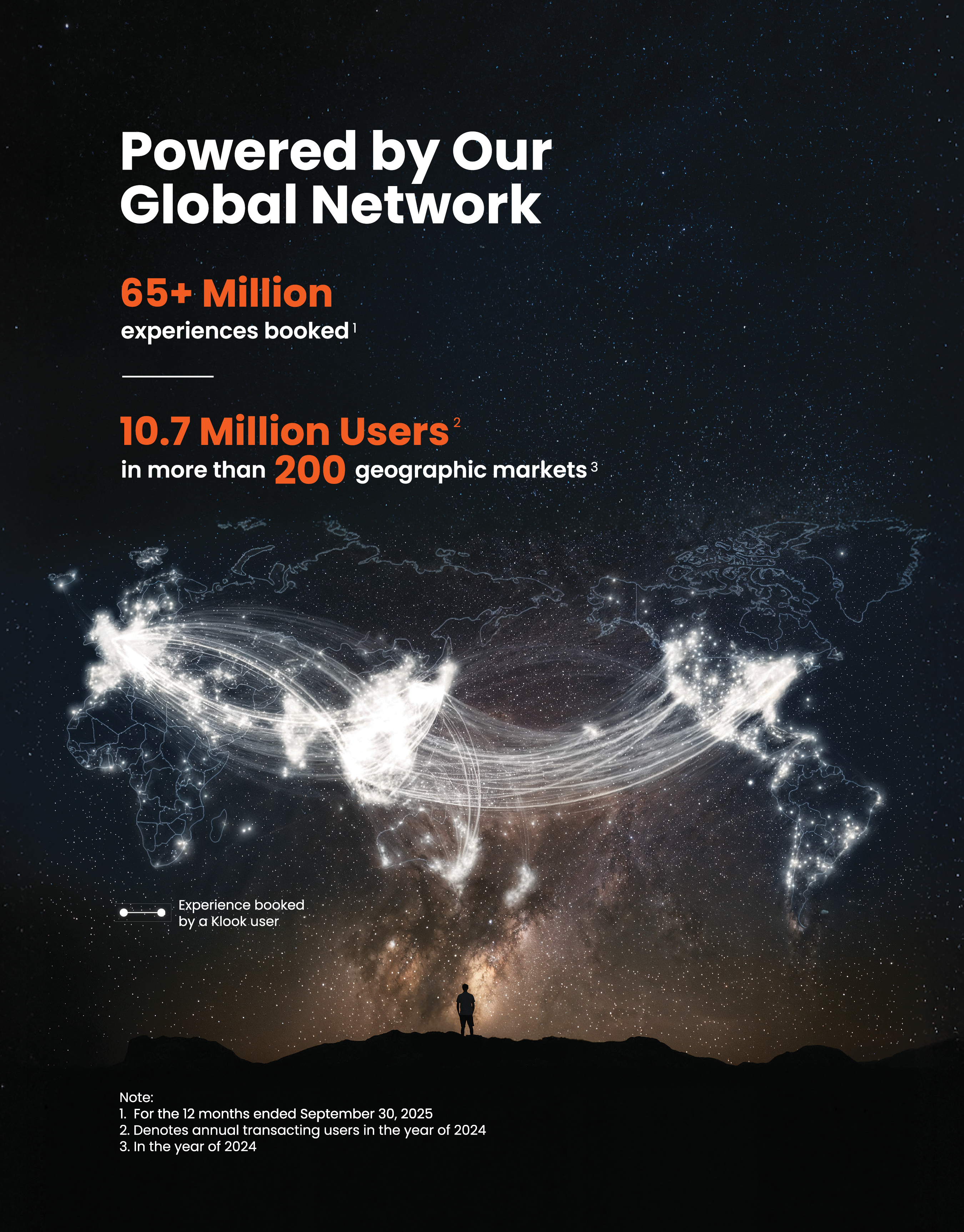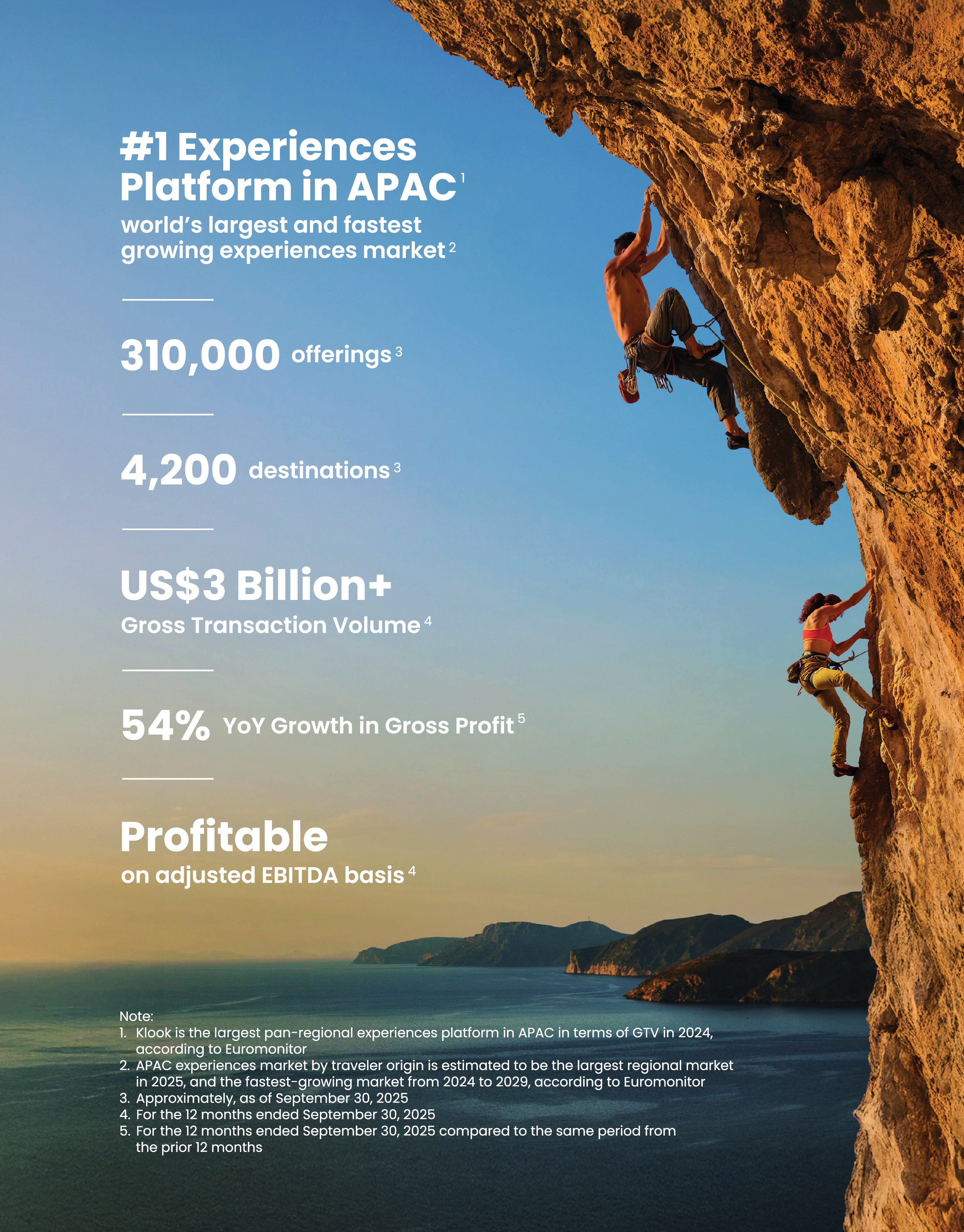 business areas. This structure allows us to be considered the primary beneficiary of the VIEs for accounting purposes, which serves the purpose of consolidating the financial results of the VIEs in our consolidated financial statements under IFRS. For a summary of these contractual arrangements, see “Corporate History and Structure — Contractual Arrangements Among the VIEs, Their Respective Shareholders and Us”. The VIEs are consolidated for accounting purposes only. These contractual arrangements are not equivalent to equity ownership, and their enforceability has not been tested in a court of law. Investors in our ADSs are purchasing equity interests in Klook Technology Limited, the Cayman Islands holding company, and are not purchasing, and may never directly hold, equity interests in the VIEs. As used in this prospectus, “we,” “us,” “our company,” “our” or “Klook” refers to Klook Technology Limited and its subsidiaries, and, in the context of describing our consolidated financial information, business operations and operating data, refers to Klook Technology Limited, its subsidiaries, the VIEs and their subsidiaries. For risks relating to our contractual arrangements with the VIEs and its respective shareholders, see “Risk Factors — Risks Related to Our Corporate Structure.” Solely in relation to our PRC business, we may face risks associated with having operations in the PRC and the evolving laws and regulations of the PRC. For a detailed description of these risks, please refer to the risks disclosed under “Risk Factors — Risks Related to Doing Business in the Geographic Markets in Which We Operate.”